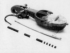 The neck and body of the instrument are made from a single piece of wood. Animal hide is stretched over the lower half of the belly. The instrument is placed vertically on the left knee, suspended in front of the body by means of a cord around the left shoulder, and is played with a bow. Used by street musicians called gaine in performances of narrative tales and folk song.