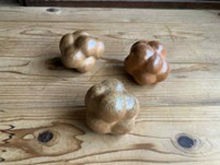 本プロジェクトで得られた知見をもとに牧野窯で作られた萩焼。中に同質の球が入っており振ると萩焼の音がする。2024年に東京の学生らによるワークショップで生まれた、粘土製の美しいかたちが3Dプリントアウトされ、その型を使う手法により成形され、登り窯で焼かれた。萩の土、萩の炎から生まれた、視覚、聴覚、触覚にうったえるオブジェである。